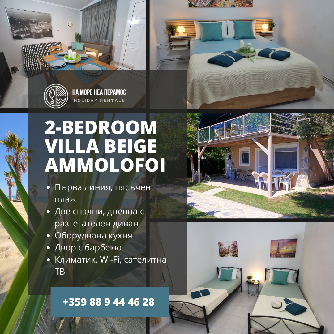 Вила на първа линия на плаж Амолофи – Перфектното място за почивка! 🌊🏡 Събуждайте се с шума на вълните в тази просторна вила на първа линия в Неа Перамос, само на няколко крачки от златистия пясък на плаж Амолофи. Тук ще намерите всичко необходимо за една незабравима и комфортна почивка. ✨ Какво ще ви хареса: ✅ Топ локация на плажа – директен достъп до един от най-красивите пясъчни плажове в района. ✅ Удобно настаняване до 6 души – 2 уютни спални + дневна с разтегателен диван. ✅ Напълно оборудвана кухня – с миялна машина, кафе машина и всичко необходимо за домашно приготвени ястия. ✅ Просторен двор с барбекю – лятна кухня и зона за хранене на открито за незабравими вечери под звездите. ✅ Релакс зона – шезлонги, чадъри и хамаци за пълно отпускане край морето. ✅ Модерни удобства – климатик, WiFi, сателитна телевизия и безплатен паркинг. Перфектно място за семейства, двойки или приятели, които търсят комфорт, уединение и спираща дъха гледка към морето. Резервирайте своята почивка и изживейте магията на Неа Перамос! 🌴✨